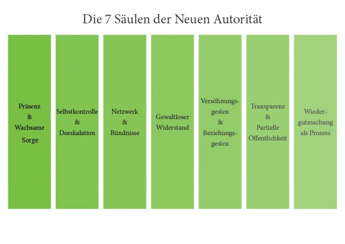 Hier setzt das Modell der Neuen Autorität nach dem Konzept der 7 Säulen (Haim Omer/2011) an: Stärke statt Ohnmacht. Es versucht erfolgreiche Entwicklungsprozesse in Gang zu setzen und ein respektvolles, konstruktives Miteinander zu ermöglichen, um gewünschte Zeile zu erreichen.